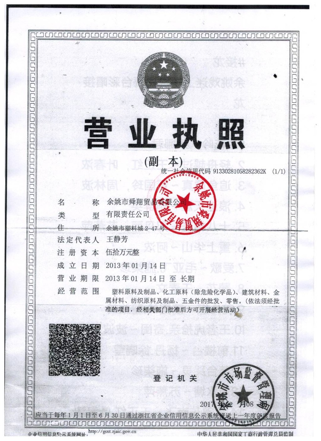 公司名称余姚市舜翔贸易有限公司注册号91330281058282362K