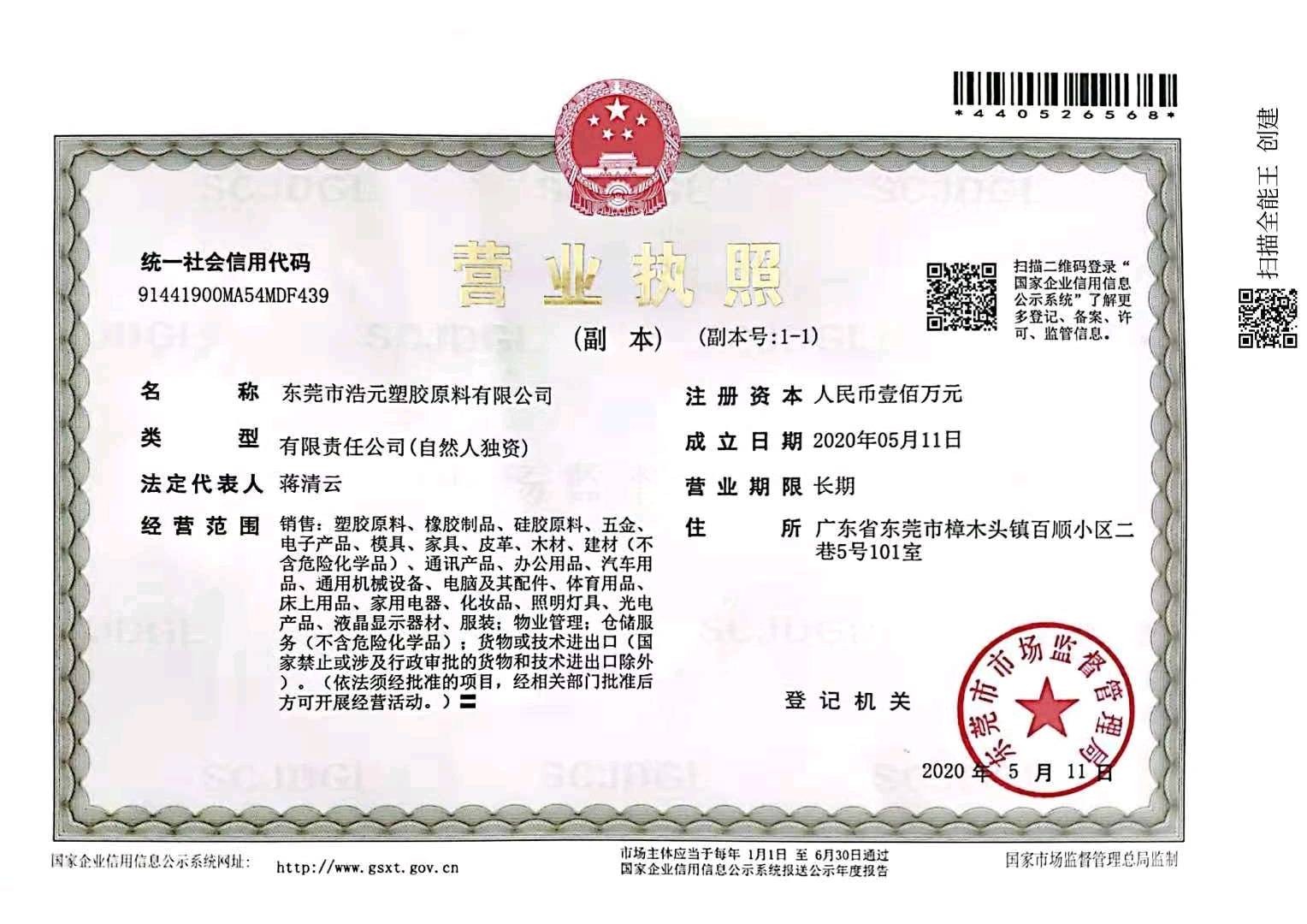 公司名称东莞市浩元塑胶原料有限公司注册号91441900MA54MDF439