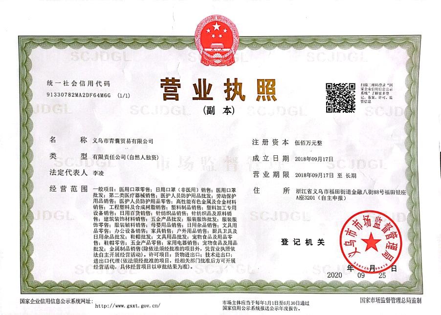 公司名称义乌市青囊贸易有限公司注册号91330782MA2DF64M6G