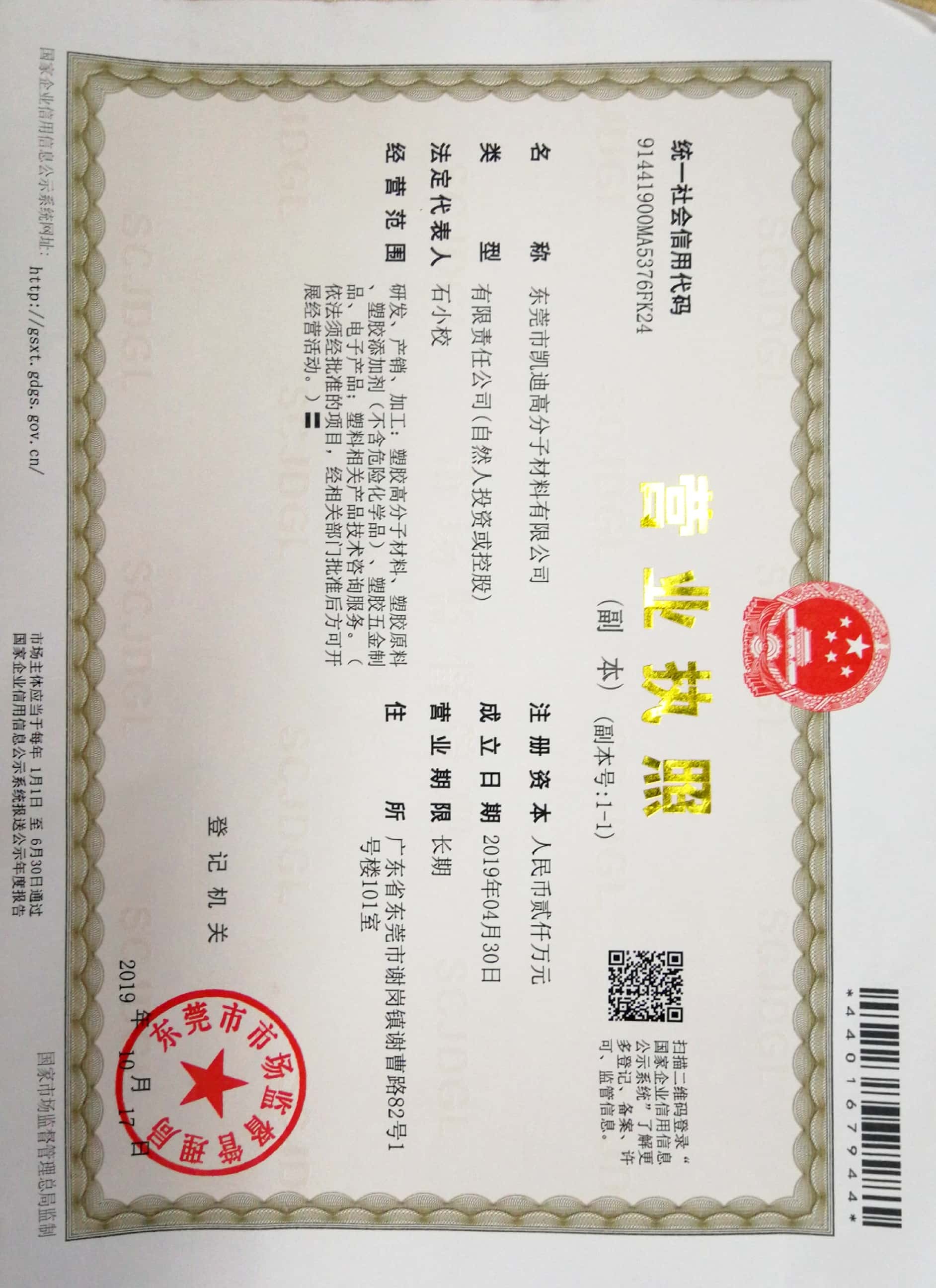 公司名称东莞市凯迪高分子材料有限公司注册号91441900MA5376FK24