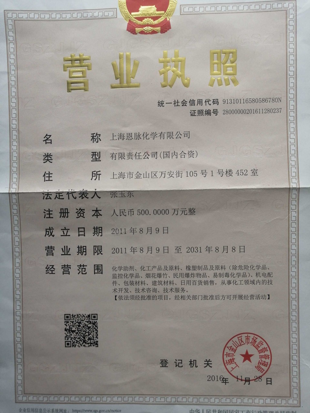 公司名称上海恩脉化学有限公司注册号91310116580586780N