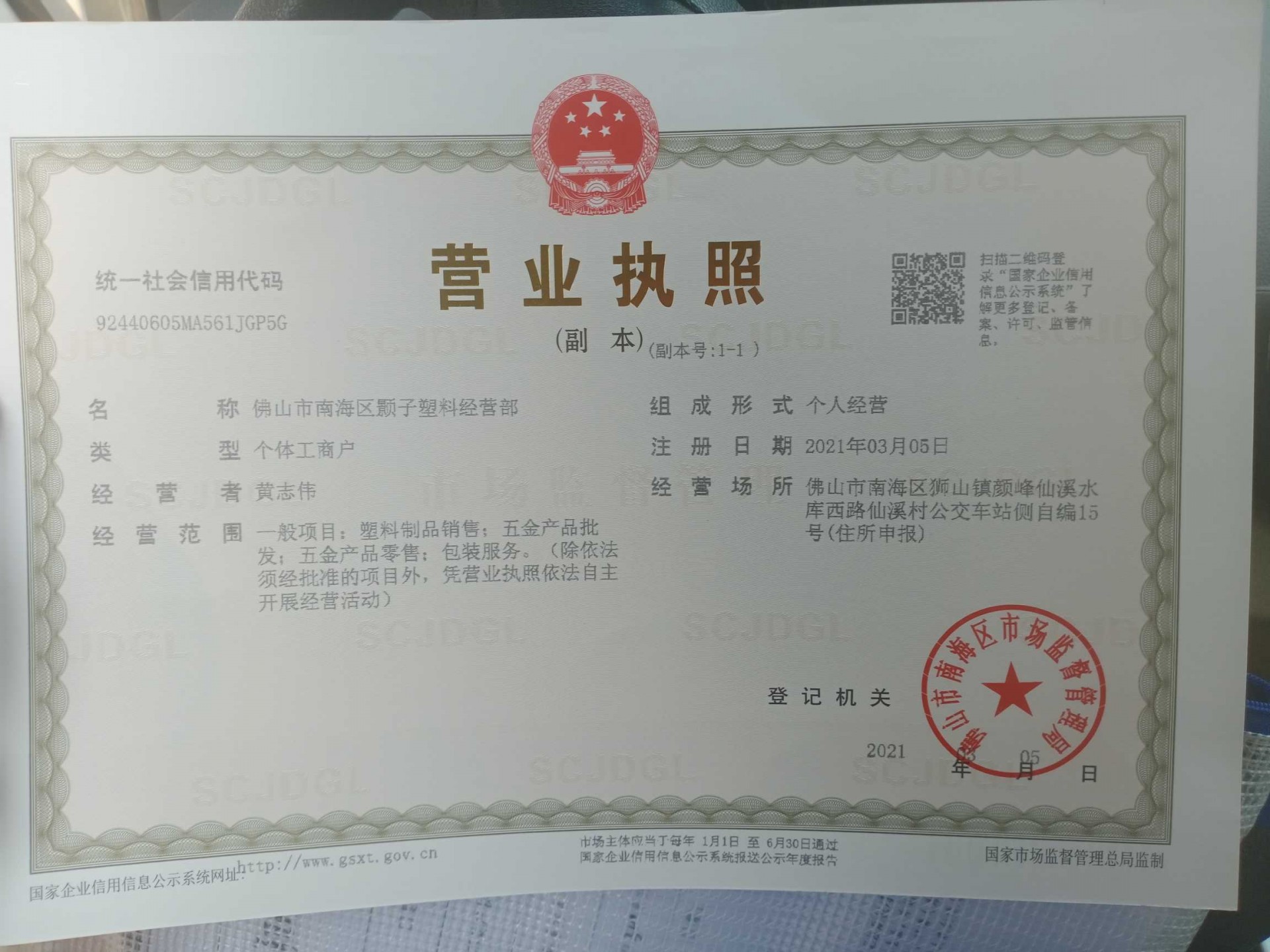 佛山市南海区狮山镇颜峰仙溪水库西路仙溪村公交车站侧自编15号(住所申报)