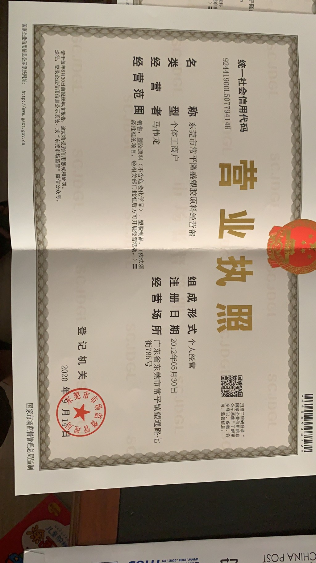 公司名称东莞市常平隆盛塑胶原料经营部注册号92441900L50779414H