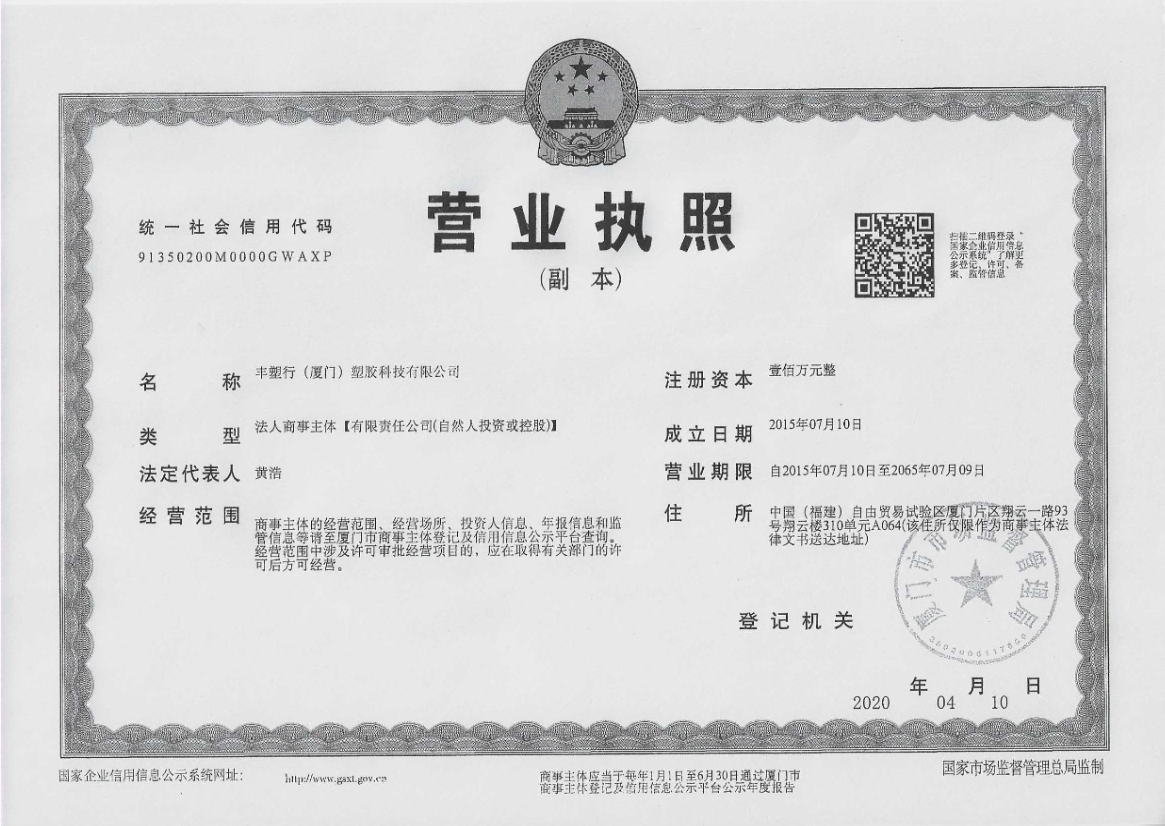 公司名称丰塑行(厦门)塑胶科技有限公司注册号91350200M0000GWAXP