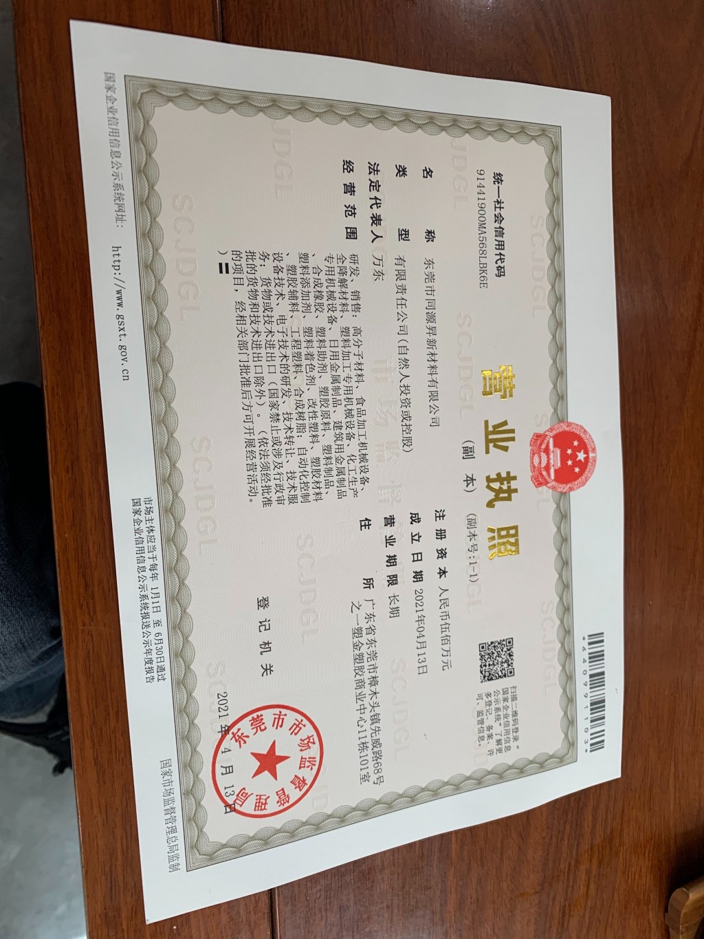公司名称东莞市同源昇新材料有限公司注册号91441900MA568LBK6E