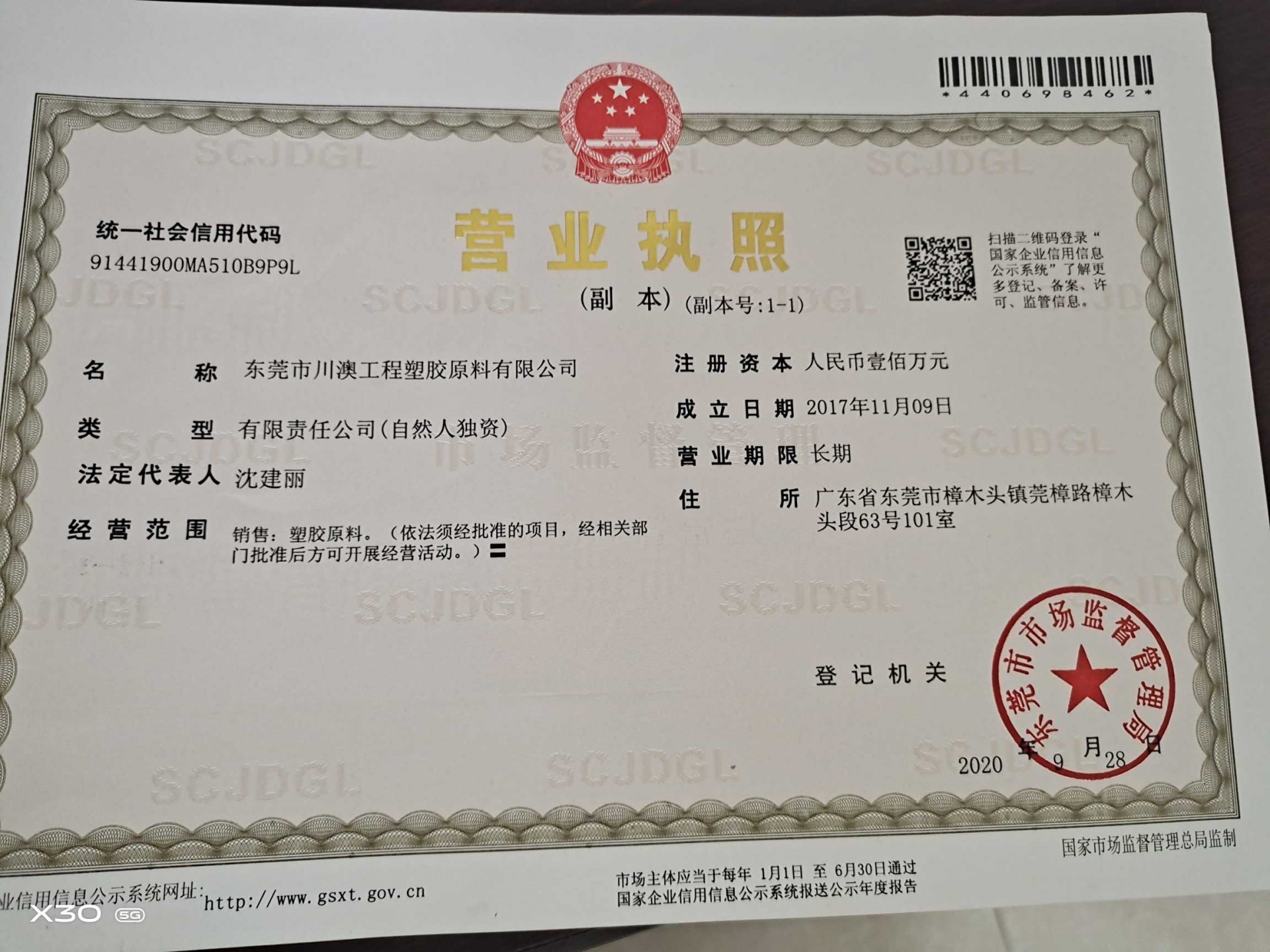 公司名称东莞市川澳工程塑胶原料有限公司注册号91441900MA510B9P9L
