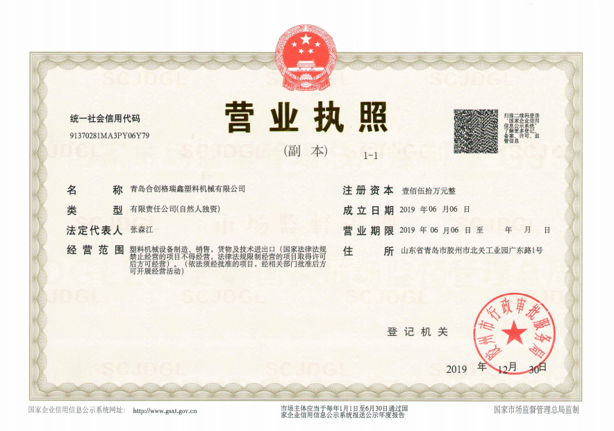 公司名称青岛合创格瑞鑫塑料机械有限公司注册号91370281MA3PY06Y79